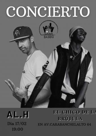 - Viernes 17, 19:00. Concierto de rap: AL.h + El Chico de la Brújula + DJ Saxe.