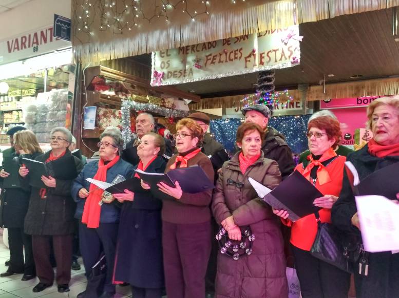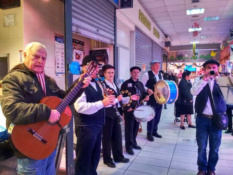 Nada más entrar al mercado suenan dulzainas y tambores tocando algún popular villancico. Se trata de los miembros del grupo del Centro Municipal de Mayores de San Vicente de Paul que son los primeros en actuar esta mañana en el mercado. Marchan como una charanga entre los puestos de frutas, encurtidos y carnes mientras las clientas habituales del mercado les fotografían sonrientes, moviendo un poco el cuerpo al ritmo de la música. Después vendrán los componentes de la Coral de Villancicos del Centro Municipal de Mayores Roger de Flor, los del Taller de Cuatro Venezolano de la Asociación de Vecinos Tercio Terol y, para cerrar la mañana, habrá un desfile de danzas de Paraguay a cargo de la escuela Kathia Coronel.