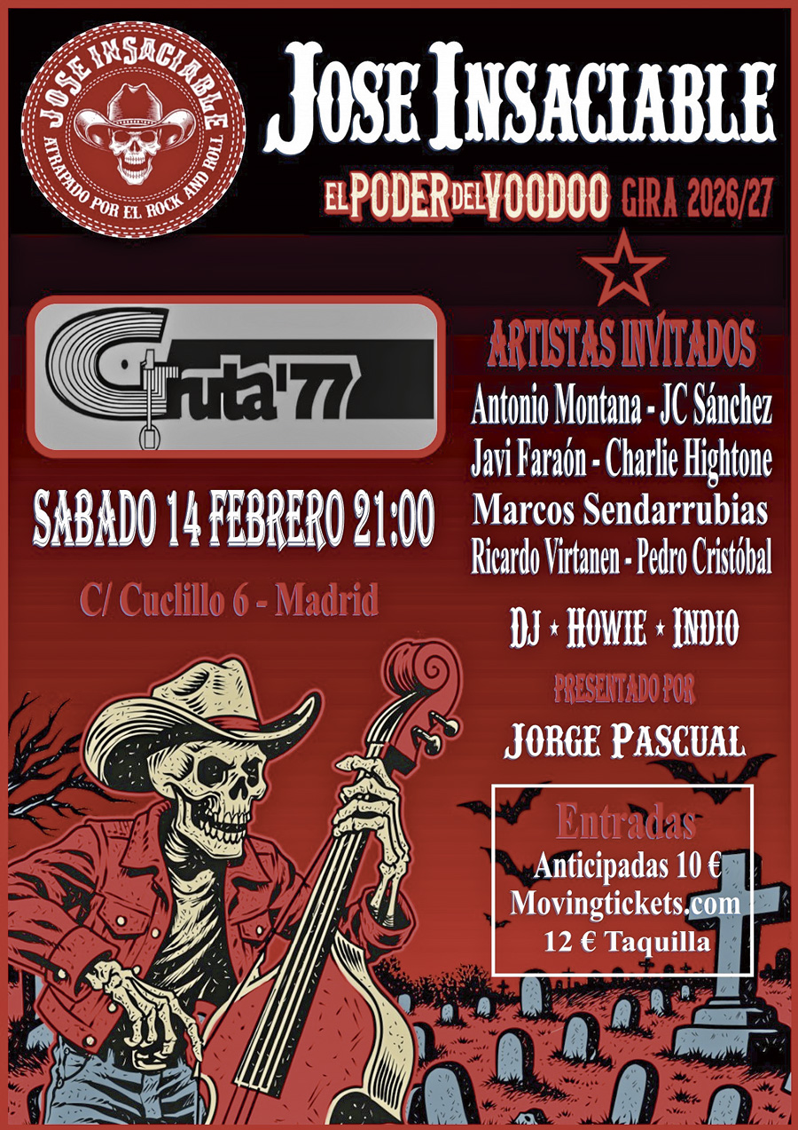 El próximo 14 de febrero, Día de los Enamorados, tenemos en el barrio un plan insuperable para los enamorados y enamoradas de la marcheta guapa. Oh yeah, porque esa misma noche está programado el fantabuloso concierto de presentación de la gira de El poder del voodoo, el último trabajo discográfico de Jose Insaciable, campeones del rocanrol carabanchelero, que la van a liar bien parda en la Gruta 77 (C/ Cuclillo, 6… pero tú ya sabes de sobra dónde está, ¿cierto?) a partir de las 21:00 con sus sonidazos de rock & roll, rockabilly, country, blues, boogie y mucho más, todo de categoría.