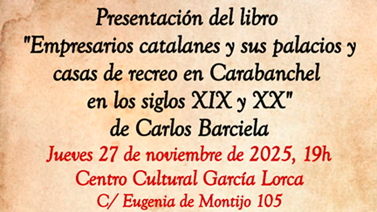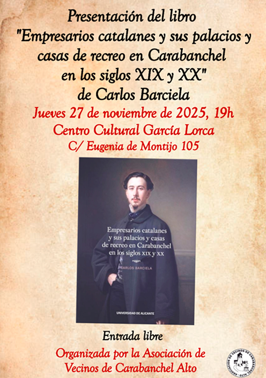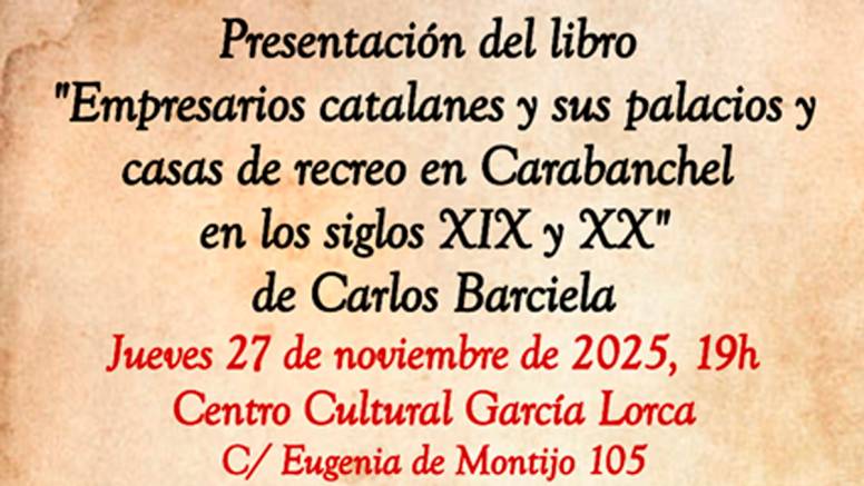 Mañana, jueves 27 de noviembre, tendrá lugar en el Centro Cultural García Lorca (C/ Eugenia de Montijo, 105) a las 19:00 la presentación de un interesante libro relacionado con la rica historia de nuestro distrito: Empresarios catalanes y sus palacios y casas de recreo en Carabanchel en los siglos XIX y XX, de Carlos Barciela.