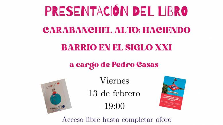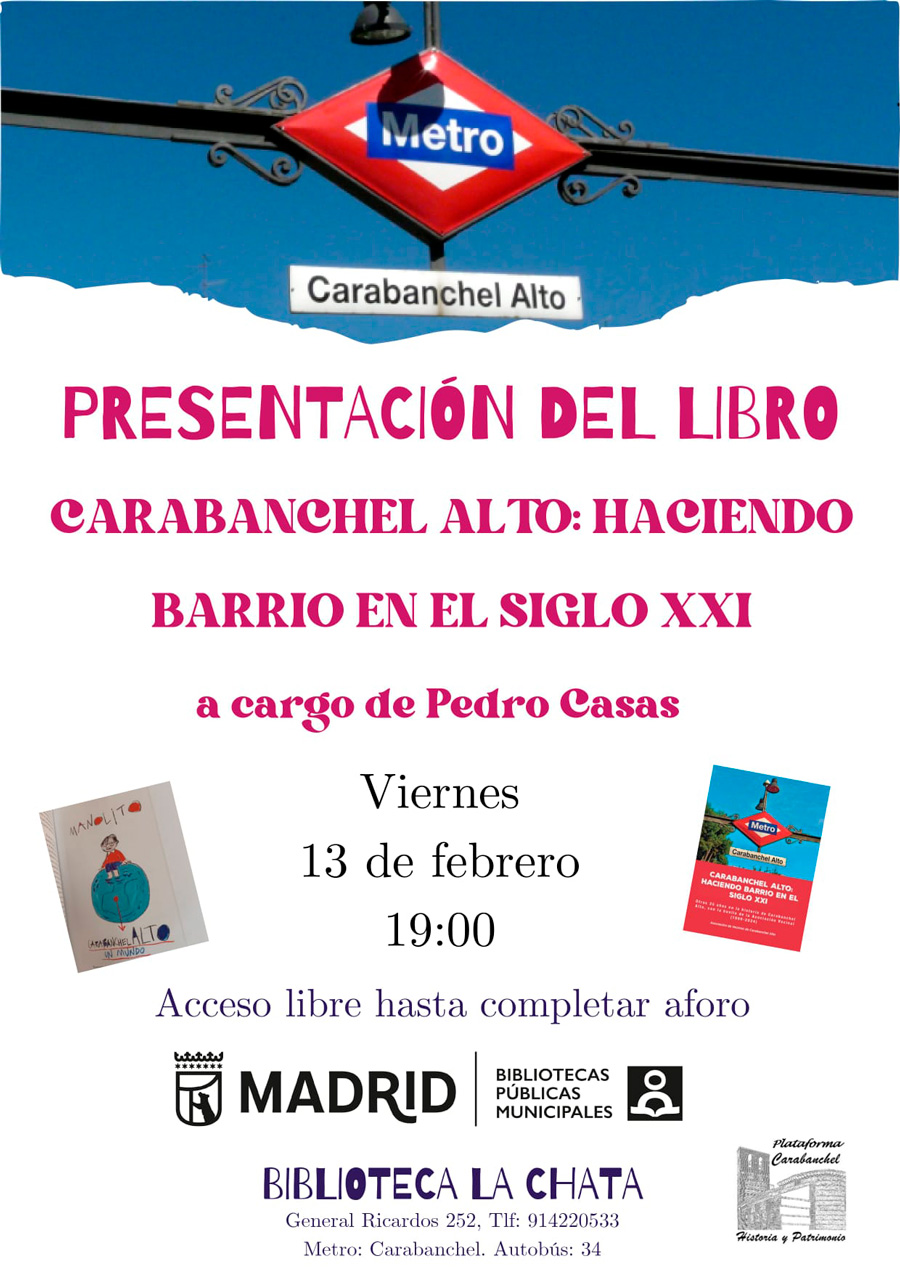 El presente acto de presentación del libro tendrá lugar el viernes 13 de febrero, a las 19:00, en la Biblioteca La Chata (C/ del General Ricardos, 252), siendo la entrada libre hasta completar aforo.
