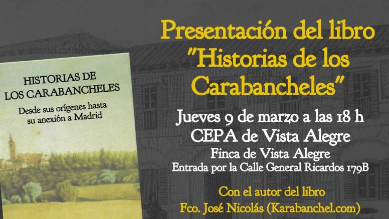 El jueves 9 de marzo, a las 18:00, tendrá lugar en el CEPA de Vista Alegre (Finca de Vista Alegre. Entrada por la C/ General Ricardos, 179B) la presentación del libro Historias de los Carabancheles. El evento, organizado por la Asociación de alumnado y profesorado del CEPA de Vista Alegre, contará con la presencia de su autor, Francisco José Nicolás.
