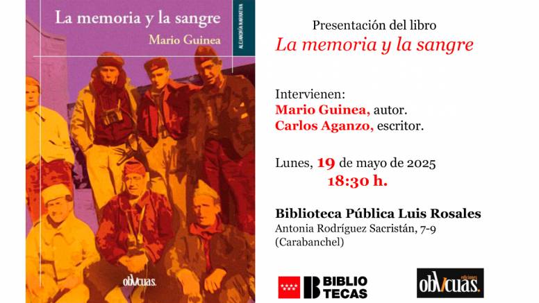 El lunes 19 de mayo, a las 18:30, tendrá lugar en la Biblioteca Pública Luis Rosales (C/ Antonia Rodríguez Sacristán, 7-9) la presentación de La memoria y la sangre, de Mario Guinea, “memorias noveladas” sobre la guerra, la posguerra y la incipiente democracia en España en las que se imbrican tres relatos autobiográficos (abuelo, hija y nieto) —con el telón de fondo de la crisis del coronavirus—, cargadas de realismo, emoción, humanidad y entreveradas por costumbristas chispazos de humor.