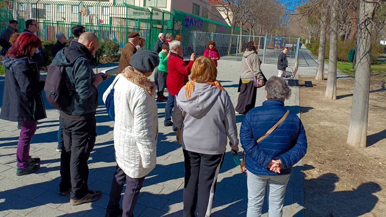 Es al lado de este parque, en la plaza del Parterre, donde quedamos para presentar la segunda edición de la Guía de los árboles de Carabanchel Alto al aire libre, como corresponde. El paseo se realizó el sábado 17 de febrero, con muy buena compañía: unas 24 personas inquietas y atentas de todas las edades y un perrete estuvimos saludando a la mayoría de los árboles (y a algún pájaro, los mejores amigos de los árboles, según Lorca) de esta guía.