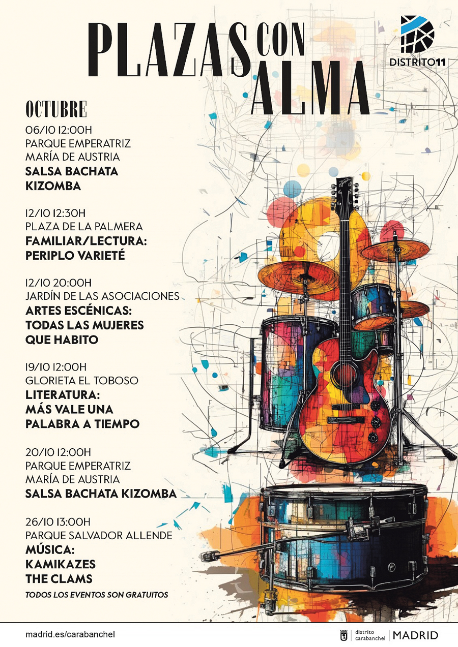 El mes de septiembre ha arrancado Plazas con Alma, una iniciativa que pretende llevar la cultura en todas sus formas a diferentes plazas del distrito de Carabanchel. Con la participación de varias asociaciones vecinales y culturales del Distrito, este ciclo pone el foco en el desarrollo local a través de la cultura en la calle. Todos los eventos son gratuitos.