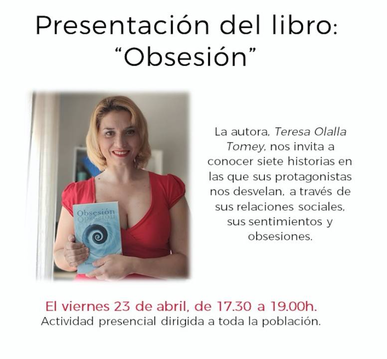 El próximo 23 de abril de 2021, Día internacional de Libro, Teresa Olalla presenta su primera novela “Obsesión” en el Espacio de Igualdad “María de Maeztu” a las 17:30. (C/ Comandante Fontanes nº8. Esq. C/General Ricardos, 50)