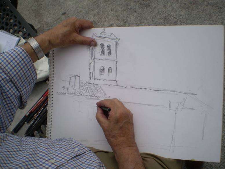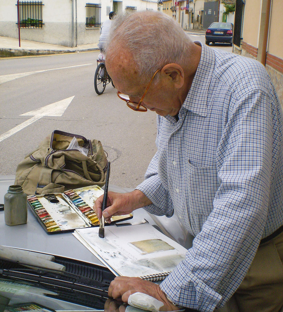 Alfredo, ya mayor, trabajando fuera de su estudio (abajo). Foto: Linda Hament