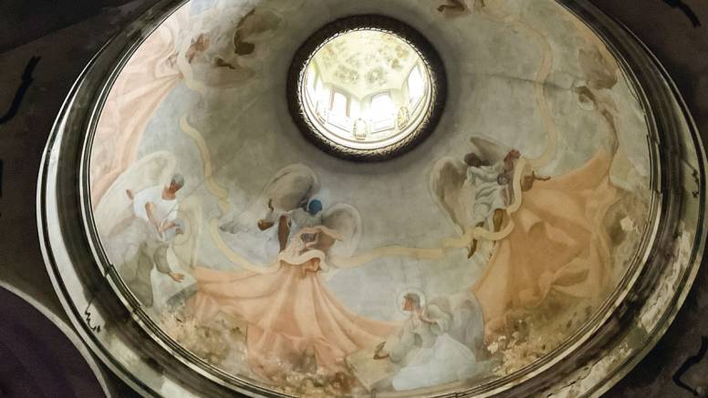 El reto era importante para un joven estudiante en el último año de su formación: una cúpula (pared, superficie curva, a unos tres pisos de altura) de unos diez metros de diámetro y alrededor de 340 m2 de superficie. No puede elegir tema: ha de pintar la escena de los cuatro evangelistas. “Siempre me decía —recuerda Linda— que, a pesar del duro trabajo, tenía muy buenos recuerdos de la experiencia, sobre todo por la gente que trabajaba con él, me refiero a los obreros. Además él, por la forma en la que recibió ese encargo, se sentía bastante arropado por sus profesores. Sabía que era muy joven y le daba cierto respeto, pero tenía que demostrárselo no solo a sí mismo, sino también a Chumillas y a Stolz, que habían confiado en él”. El trabajo no fue nada sencillo: además de su parte tenía que contar con albañiles, escayolistas, etc. “Él siempre, cuando me contaba la experiencia, me decía que esos tipos eran algo rudos, pero muy simpáticos y muy buenos trabajadores, y se reía mucho al recordar como aquellos hombres quedaron muy sorprendidos con que el encargo lo fuera a hacer un hombre tan joven, y siempre le estaban tomando el pelo y haciéndole bromas”, evoca Linda.