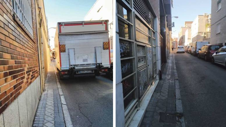 En la calle de Linares, cerca de Oporto, no hay aceras para los peatones. Es una calle estrecha y bastante peligrosa, los coches vienen de General Ricardos a gran velocidad y sus retrovisores hacen que te tengas que pegar a la pared para que no te lleven por delante. Y encima hay salida y entrada de un colegio, con mucho peligro para los alumnos. Ninguna reclamación de los vecinos ha tenido éxito: aquí estamos hasta que pase lo inevitable.