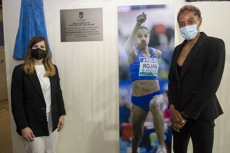 La concejala delegada de Deporte, Sofía Miranda, junto con la atleta venezolana, Yulimar Rojas, ha descubierto la placa que homenajea a la deportista en el Centro Deportivo Municipal Gallur por el récord del mundo de triple salto indoor que batió el 21 de febrero de 2020 en esas mismas instalaciones.