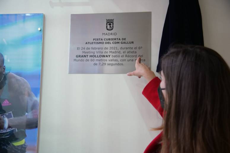 La concejala delegada de Deporte, Sofía Miranda, acompañada por el presidente de la Real Federación Española de Atletismo, Raúl Chapado, y el concejal del distrito de Latina, Alberto Serrano, descubrían el 21 de abril la placa en homenaje al atleta estadounidense Grant Holloway, que desde ese día recuerda en el Centro Deportivo Municipal Gallur el récord del mundo de los 60 metros vallas que consiguió en esa pista durante la Reunión Internacional de Atletismo Villa de Madrid.