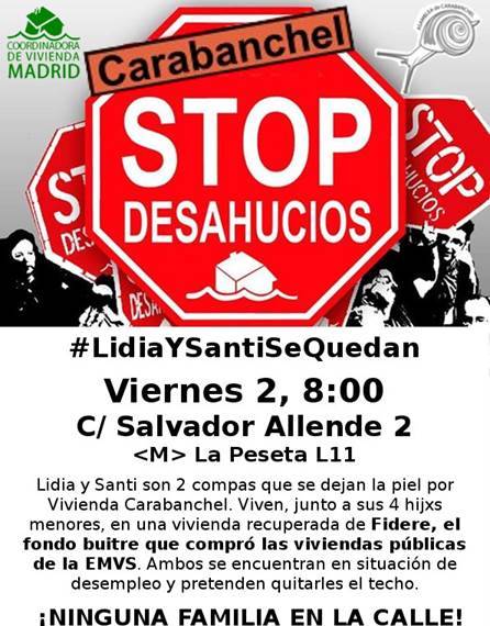 El viernes 2 de junio una familia de vecinos, Lidia, Santi sus 4 hijos y el/la que esperan, van a ser desahuciados por el fondo buitre Blackstone a través de su filial Fidere.