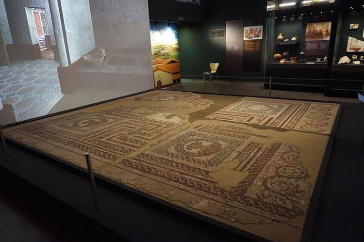 de la Real Academia de la Historia, en el año 1819 los condes mandan cercarlo y cubrirlo mediante una edificación de un solo piso, para evitar que siga deteriorándose.Este mosaico consiste en una composición de forma cuadrangular, ceñida por orlas de labores geométricas y representando las cuatro estaciones, con bellas alegorías en los medallones de los vértices. Su finalidad debió de ser la de servir de pavimento al triclinio de alguna terma o villa romana allí existente. Actualmente se encuentra expuesto en el Museo de los Orígenes de Madrid. Junto a este mosaico se encontró una escultura de bronce representando a Minerva.