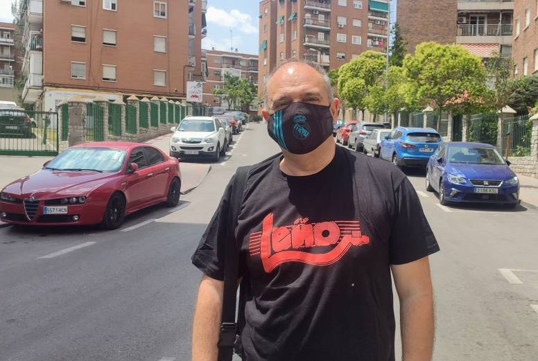 Julián nos recibe amablemente en su casa del barrio de San Isidro, sentado en su sillón, equipado con mascarilla de su equipo, el Real Madrid, camiseta de uno de sus grupos favoritos, Leño y cojín de AC/DC.