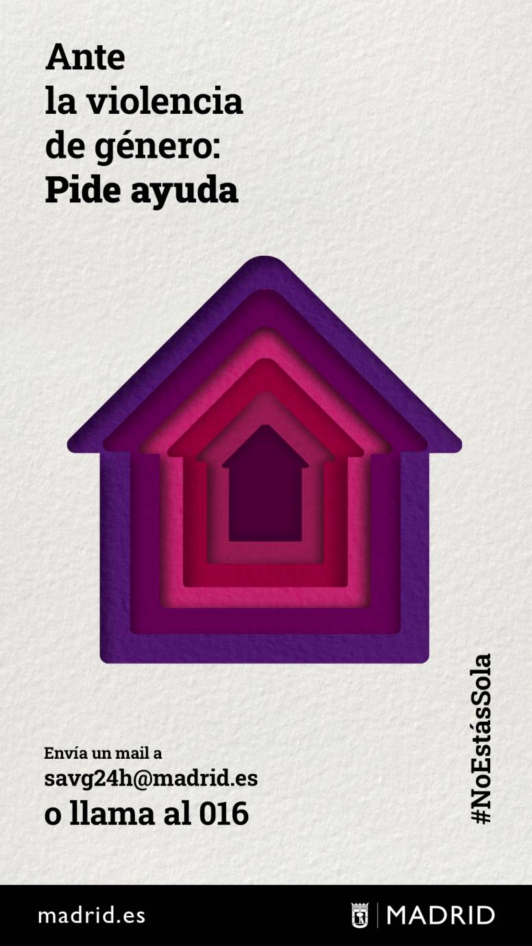 El Ayuntamiento de Madrid ha extendido su campaña NoEstásSola para prevenir la violencia contra las mujeres en el contexto del confinamiento debido a la crisis sanitaria de COVID-19. La campaña pretende reforzar la presencia de los recursos para víctimas de violencia y recordar los datos de contacto a los que pueden recurrir las mujeres que la sufren: los teléfonos 016 y 900 222 100 y la dirección de correo electrónico savg24h@madrid.es.