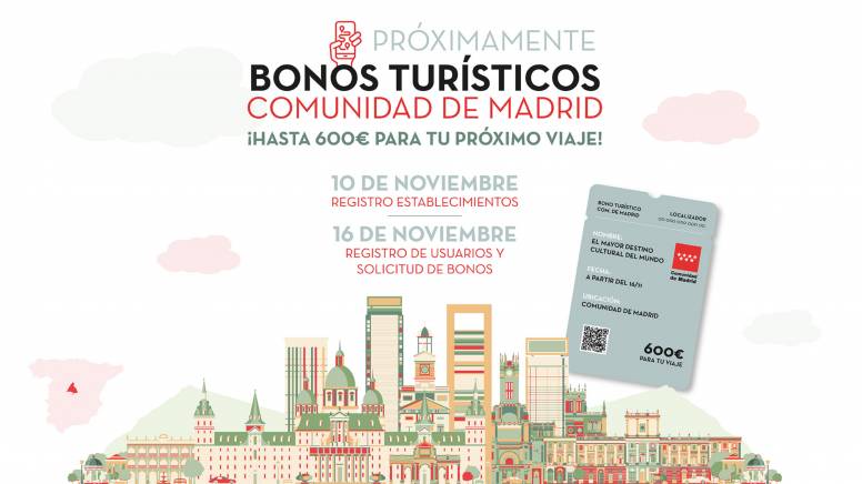 La presidenta de la Comunidad de Madrid, Isabel Díaz Ayuso, ha anunciado hoy que los nuevos bonos turísticos de hasta 600 euros que el Gobierno regional va a poner en marcha estarán disponibles este mes, en concreto, a partir del próximo 16 de noviembre, para los ciudadanos, que podrán solicitarlos en el enlace www.bonosturisticoscomunidaddemadrid.es, donde también habrá información de las empresas adheridas al programa.