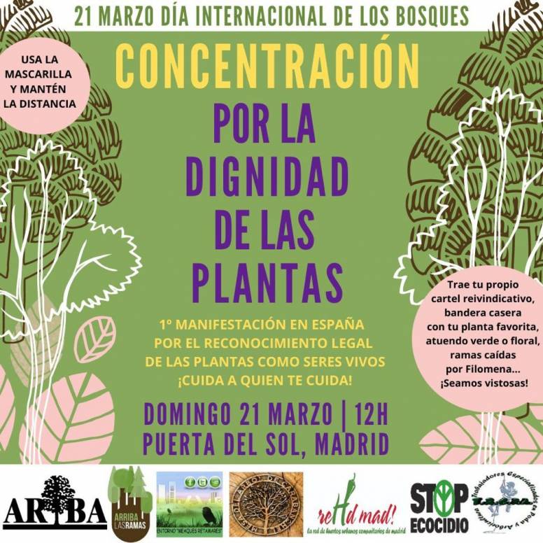 Colectivos ecologistas y ambientalistas se reunirán este domingo, 21 de marzo a las 12 horas en la Puerta del Sol en lo que han descrito como "la primera concentración en favor del reconocimiento legal de la dignidad de las plantas".
