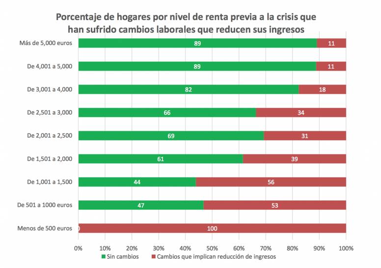 El estudio llevado a cabo por el Ayuntamiento de Madrid, desgrana que la reducción de ingresos más severa se produce en los hogares con rentas inferiores a los 2.000 mensuales y, particularmente, en los niveles más bajos de ingresos (menos de 500). Esto no hace más que ahondar en uno de los grandes problemas provocados por la pandemia del Covid-19. Esta, como todas las crisis económicas y sociales, afectará, de nuevo, en mayor medida a la clases más bajas.