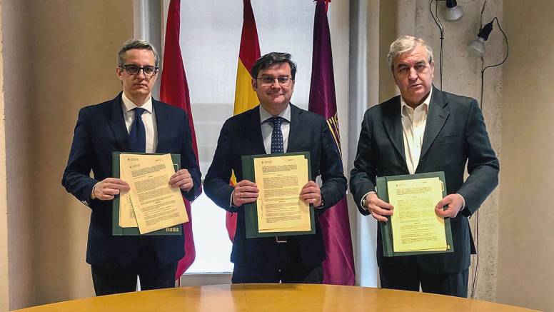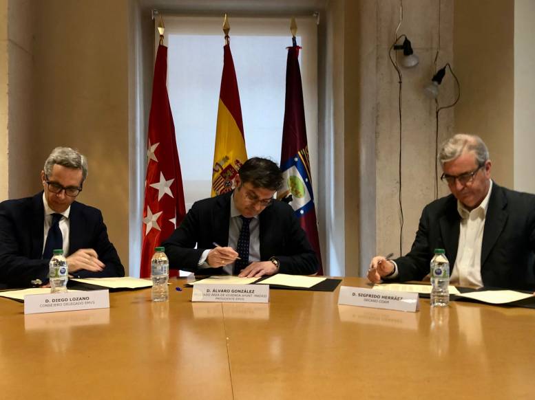 El concejal delegado de Vivienda, Álvaro González; el consejero delegado de la Empresa Municipal de la Vivienda y Suelo de Madrid (EMVS), Diego Lozano, y el decano del Colegio Oficial de Arquitectos de Madrid (COAM), Sigfrido Herráez, firmaban el 3 de mayo un convenio de colaboración para convocar dos concursos de proyectos de arquitectura para la construcción de sendas promociones de viviendas de protección pública en arrendamiento en dos parcelas propiedad de la EMVS, en los distritos de Carabanchel y Barajas.