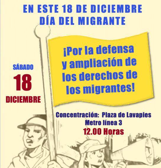 Con la expulsión de 27 mil personas migrantes del sistema sanitario de la Comunidad de Madrid de fondo, se ha convocado este sábado 18 de diciembre, a las 12:00h una concentración en la plaza de Lavapiés por la defensa y ampliación de los derechos de los migrantes en España, la Unión Europea y el mundo. Con estos, los colectivos democráticos pretenden hacer conciencia de la lamentable situación que viven los migrantes que buscan refugio en estos países al no encontrar solución a sus problemas vitales en sus países de origen.