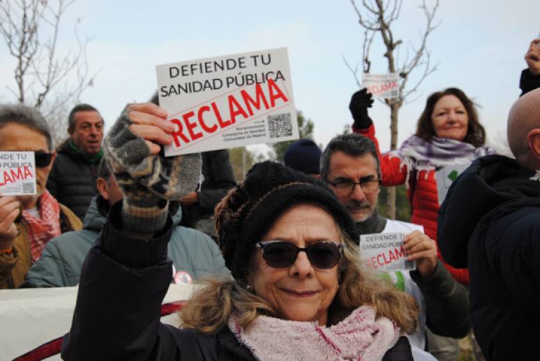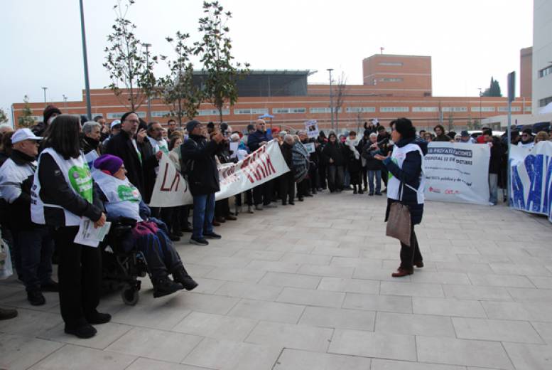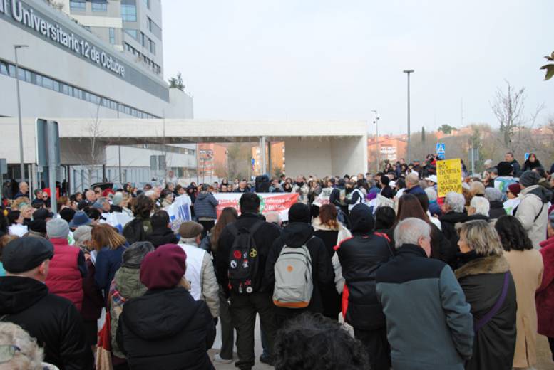 Alrededor de medio millar de personas acudieron el sábado 14 de diciembre a la convocatoria de la plataforma Vecinas y Vecinos de Barrios y Pueblos de Madrid frente a la puerta principal del nuevo edificio del Hospital 12 de Octubre en defensa de la sanidad pública. La protesta comenzó a las doce del mediodía, prolongándose durante más de una hora con un alto talante reivindicativo, entre consignas, cánticos e incluso villancicos alusivos a la causa que había reunido allí a los y las presentes.