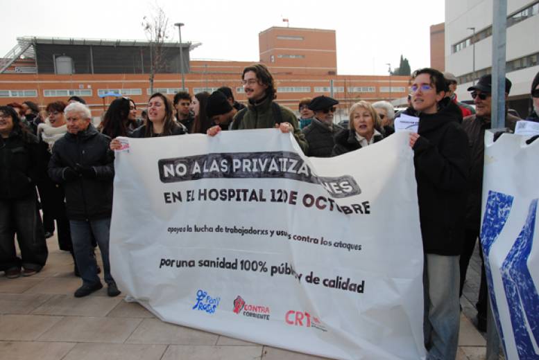 El hospital “está siendo reformado de arriba abajo con fondos de la Unión Europea y dotado de alta tecnología con fondos del Estado. Pero al tiempo que lo reformaba, la Consejería de Sanidad de Madrid está externalizando y privatizando servicios. Así, a medida que se iba desplazando la actividad del viejo edificio al nuevo, la Administración ha ido recurriendo a empresas privadas para que realizaran funciones que antes prestaban profesionales de la sanidad pública. Ha ocurrido con el almacén general, con parte de las cocinas y recientemente con la esterilización del instrumental quirúrgico de los más de 30 quirófanos. Dicha esterilización era antes gestionada internamente, realizándose entre el servicio de Esterilización y el personal de quirófano. Según denuncian sanitarios y sanitarias, con esta última privatización se ha arruinado el servicio de Esterilización, ya que los numerosos fallos de la empresa Croma Gio.Batta Iberia, proveedora de material quirúrgico, han llevado a la suspensión de cirugías, una situación que representa un riesgo directo para la salud y seguridad de los y las pacientes”, explicaba la Asamblea Popular de Carabanchel en el comunicado dirigido al vecindario de dicho distrito, uno de cuyos hospitales de referencia es el 12 de Octubre, animándole a secundar la protesta.