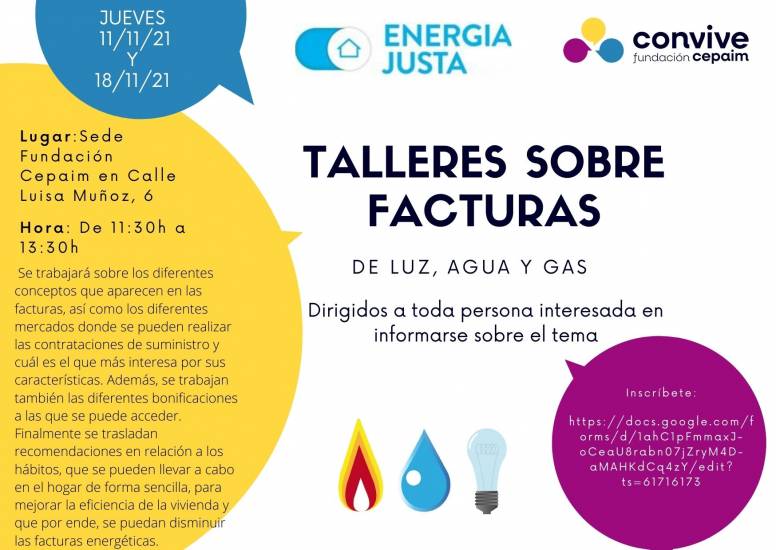 En el marco de las actividades de desarrollo comunitario del centro de Madrid Fundación Cepaim va a organizar junto al proyecto de Energía Justa dos talleres sobre lectura de facturas de luz, agua y gas los días 11 y 18 de noviembre en horario de 11:30 a 13:30 en la sala de Sali Guntín en el centro de la calle Luisa Muñoz nº6.