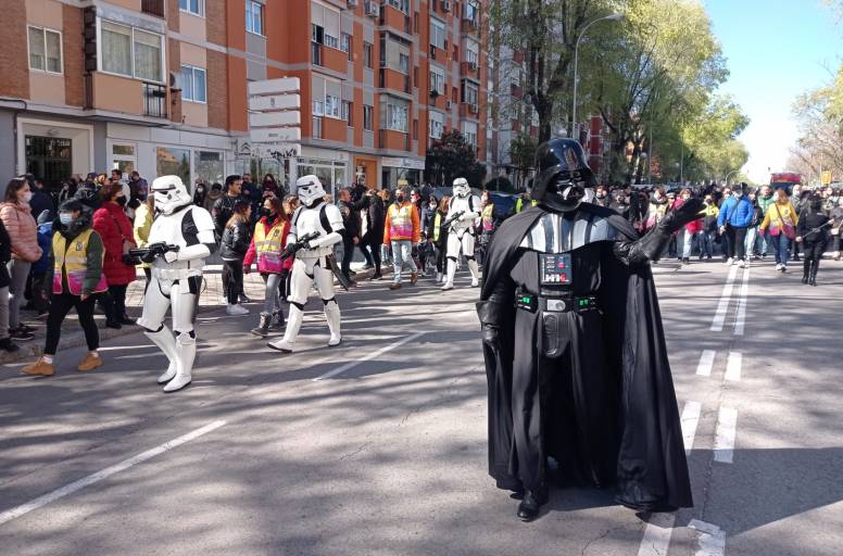 Con gran ambiente y una imponente puesta en escena, el desfile solidario del Galaxy Day arrancaba esta mañana desde la avenida de las Águilas, 14 con destino al auditorio al aire libre del parque Aluche, liderado por tropas imperiales de la Legión 501 junto a rebeldes, mandalorianos, cadetes espaciales, droides y un largo etcétera de personajes del universo Star Wars. Arropados por un público intergeneracional y al son de sintonías de la banda sonora de la mítica saga galáctica, han marchado alrededor de 250 personajes de clubes de fans de Star Wars que comparten su afición por la recreación de personajes y vestuario con calidad cinematográfica y aprovechan ‘la fuerza’ de esta pasión para colaborar en causas solidarias.