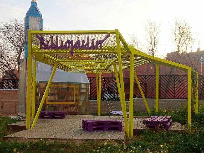 La estructura amarilla a la que nos referimos colocada junto a una cabaña, anteriormente utilizada como invernadero en Matadero, forman el llamado por Kune Office “Bibliojardin” dentro del “Jardín de Libros Nómadas”. Un complejo creado por este estudio de arquitectura, en el marco del proyecto Imagina Madrid del Ayuntamiento e Intermediae para materializar la idea presentada por la asociación La Higuera y el Almendro de un punto de lectura en el solar, mientras no llega la biblioteca solicitada en este espacio.