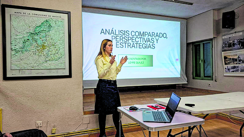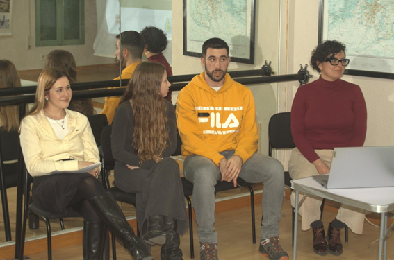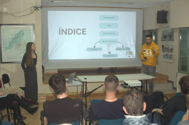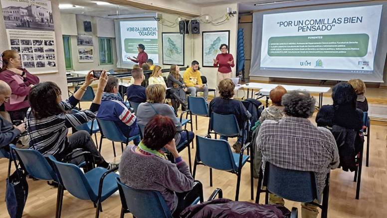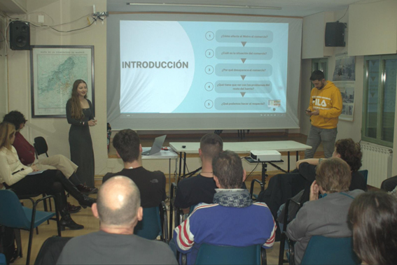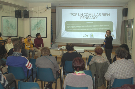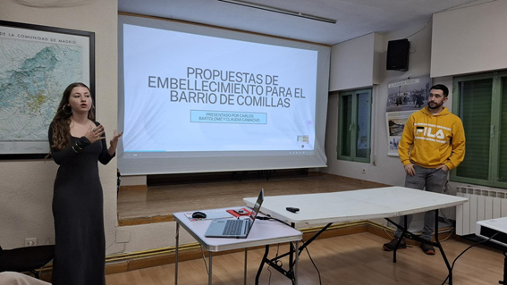 Una parte del alumnado participante en el proyecto aceptó la invitación que las asociaciones vecinal y de familias del colegio les realizaron para intervenir en la I Jornada de Historia y Memoria de Comillas en el mes de febrero. En su intervención expusieron en líneas generales los objetivos de sus trabajos y aportaron un punto de vista sobre el barrio y su problemática que fue muy valorado por las personas asistentes, entre las que se encontraban representantes políticos, profesorado y, sobre todo, los colectivos vecinales. Se trataba de una nueva mirada desde un agente externo y joven, que aportó un conocimiento especializado para afianzar los diagnósticos avanzados por los agentes del barrio. Además, la implicación del alumnado se extendió, al aceptar la invitación de la A.V. Parque de Comillas para que en una sesión explicaran al vecindario su trabajo y sus conclusiones, el pasado 20 de marzo: Leyre Quílez, Carlos Bartolomé y Claudia Camacho, junto con la profesora y responsable de estos grupos, Moneyba González Medina, organizaron la charla informativa Por un Comillas bien pensado.
