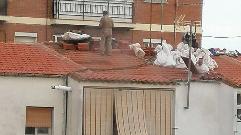 Hace relativamente poco se realizaban reparaciones de la cubierta de un edificio. Sin equipamiento ni seguridad, al verlos actuar así se les apercibió, pero al no hacer caso fue necesario llamar a la Policía, que acudió y puso orden.