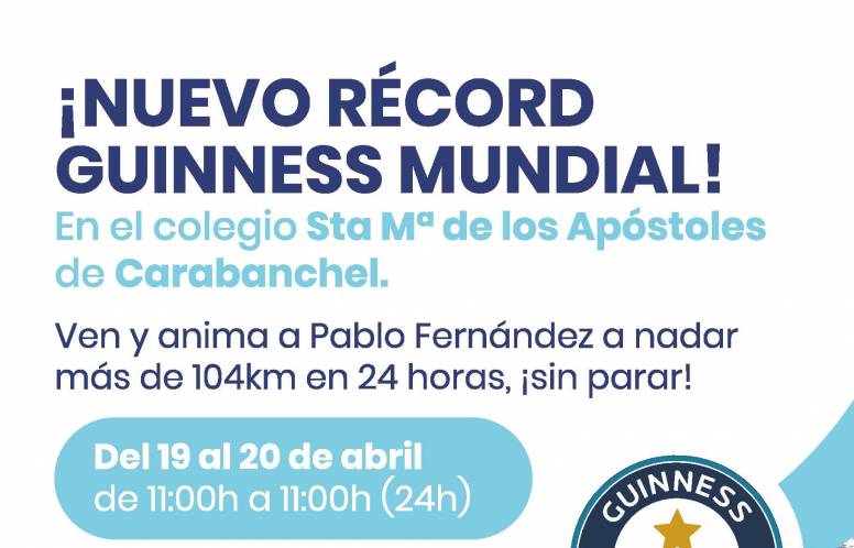 EVENTO: Con el fin de dar visibilidad al proyecto, Pablo Fernández se ha propuesto batir un nuevo Récord Guinness (ya posee cinco), esta vez en el propio Colegio Santa María de los Apóstoles. El reto consiste en nadar una distancia de 104 km en 24 horas y para ello se ha instalado una piscina portátil en nuestro polideportivo. Pablo comenzará a nadar el miércoles 19 de abril a las 11:00 h y terminará el jueves 20 también a las 11:00 h, momento en el que esperamos celebrar que lo ha conseguido