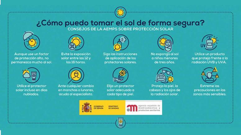— Proteger también la piel con ropa y sombreros y los ojos con gafas de sol, hidratarse bebiendo agua frecuentemente y aplicarse crema hidratante sobre la piel tras la exposición al sol.