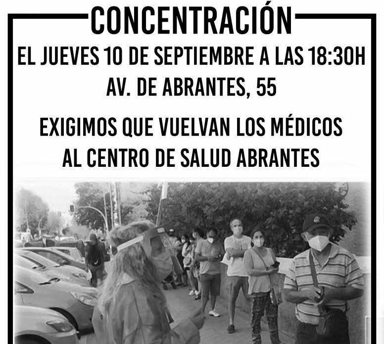 Decidimos entonces convocar una concentración exigiendo médicos y una dotación de personal suficiente para cubrir las necesidades asistenciales del área. Hemos llamado a participar al conjunto del tejido social del Distrito y al vecindario el 10 de septiembre, a las 18:00, ante el Centro de Salud Abrantes (siempre cuidando las medidas sanitarias y de prevención necesarias).