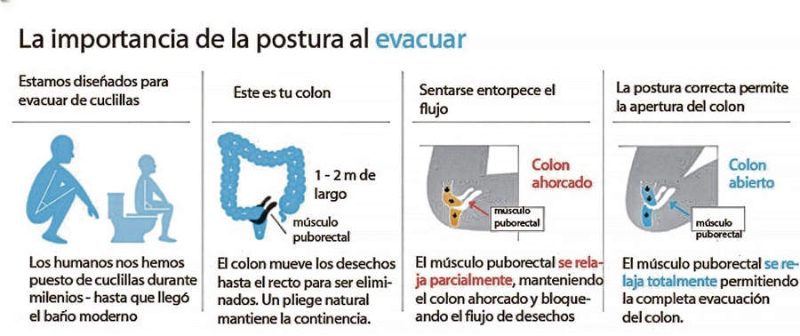 * La importancia de la postura al evacuar, permitiendo un ángulo no de 90º, si no de 35º para la relajación adecuada de los músculos del suelo pélvico, como aparece en la imagen.