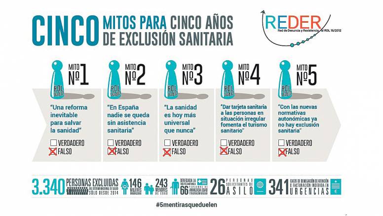 Ante la ausencia de datos oficiales sobre el impacto de las medidas contenidas en el RDL, distintas organizaciones y plataformas se han esmerado en dejar constancia de sus efectos sobre la salud y la vida de miles de personas excluidas. Estos informes periódicos sobre esta situación constituyen importantes elementos de denuncia, entre otros los obtenidos por la plataforma REDER (Red de Denuncia y Resistencia al RDL 16/2012). En su informe realizado tras cinco años de exclusión sanitaria, del que obtenemos toda esta información, hablaban de estos cinco mitos que siguen aún presentes en nuestro sistema sanitario: