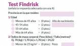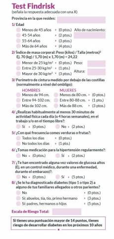 Se trata de un sencillo cuestionario eficaz y rápido de usar (lo puede realizar el propio paciente), utilizado en toda Europa. Este test tiene en cuenta la edad, índice de masa corporal, perímetro de cintura, actividad física, consumo de frutas y verduras, consumo de medicamentos para el control de la hipertensión arterial, antecedentes de glucosa en sangre elevada y antecedentes familiares de diabetes.